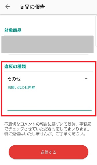 すると、「不適切な商品の報告」が出てくるので、タップすると報告入力画面になります。