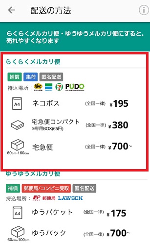 らくらくメルカリ便には配送方法が3種類あり、大きさによって料金が違います。
