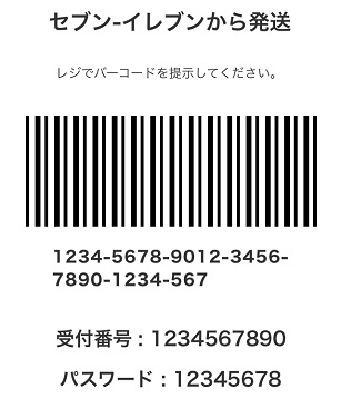 上記のようなバーコードと受付番号、パスワードが表示されたら、セブンイレブンから発送用のバーコード作成が完了です。