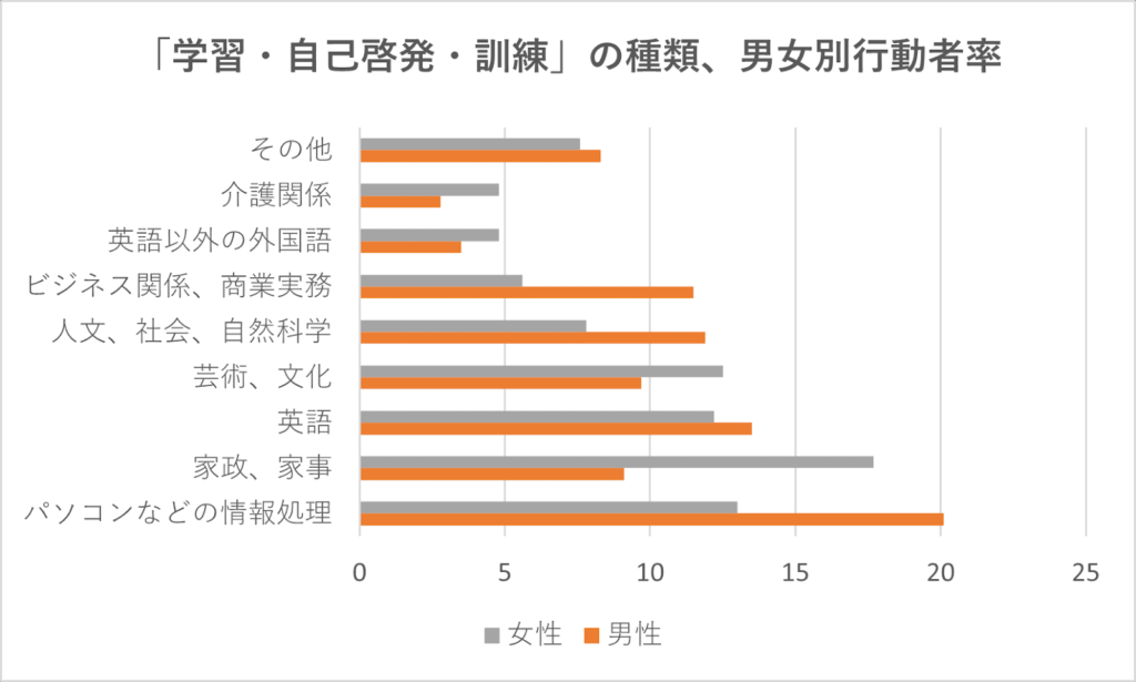 男性でもっとも多かったのがパソコンなどの情報処理、そして、英語、ビジネス関係、商業実務などが上位。女性では家政、家事が最も多い結果となりました。
