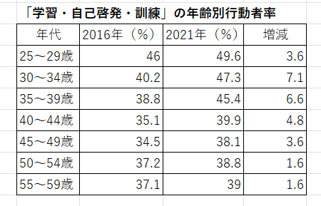 こちらは「令和3年社会生活基本調査 生活時間及び生活行動に関する結果」で、2016年と2021年に学習、自己啓発、訓練などの勉強に取り組んだ人の割合を示した表です。